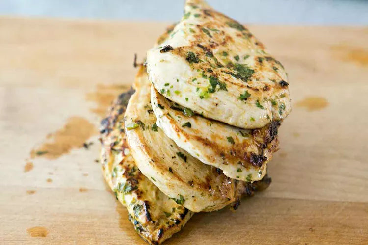 The cutlets are marinated for a minimum of 30 minutes (an hour or longer is best) in a spicy marinade with chili powder, cilantro, and jalapeño. You can marinate up to 24 hours in advance, but any longer than that and the lime juice in the marinade will start to "cook" the chicken.