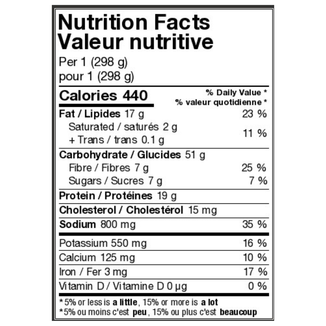 Ingredients: Cooked Grain Blend (Water, Rice, Cooked Green Lentils [Green Lentils, Water, Salt, Calcium Chloride], Lemon Juice, White Vinegar, Olive Oil, Salt, Turmeric, Black Pepper), Spiced Chicken Breast (Cooked Seasoned Chicken Breast [Chicken, Water, Salt, Pea Protein, Sugar, Onion Powder, Garlic Powder, Spice Extract],Canola Oil, Salt, Mustard Seed, Allspice, Coriander, Sugar, Chili Powder , Brown Sugar, Turmeric, Black Pepper, Fenugreek, Cayenne Pepper, Nutmeg, Cardamom), Chick Peas (Chick Peas, Water, Salt), Shawarma Dressing(Water, Garlic, Canola Oil, Extra Virgin Olive Oil, Salt, Spices, Parsley, Lemon Juice Concentrate , Mint, Xanthan Gum), Cauliflower, Pickled Red Cabbage (Red Cabbage, Water, Apple Cider Vinegar, Sugar, White Vinegar, Salt),Tomato, Raisins (Raisins, Sunflower Oil), Pumpkin Seeds.